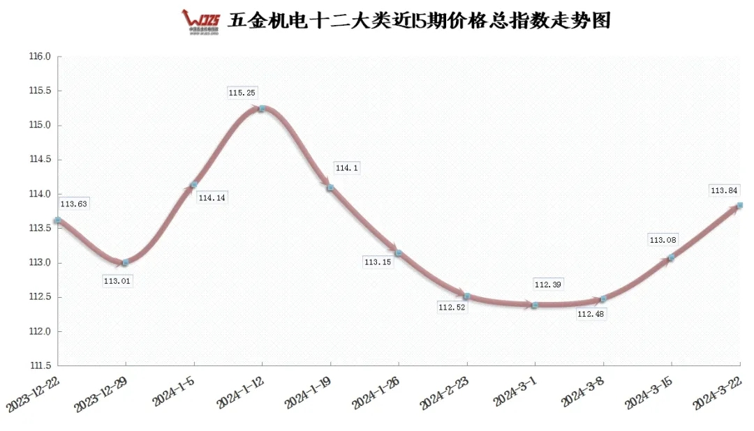 本期(2024/03/22)“中國(guó)?成都五金機(jī)電指數(shù)”(以下簡(jiǎn)稱“五金機(jī)電指數(shù)”)價(jià)格總指數(shù)收于113.84點(diǎn)與上期相比上漲0.76個(gè)百分點(diǎn),與去年同期108.13相比上漲5.71個(gè)百分點(diǎn)。